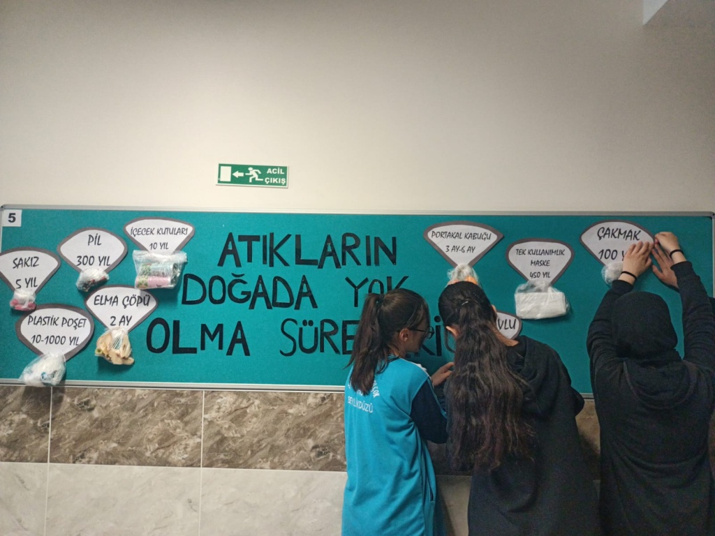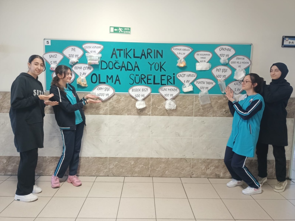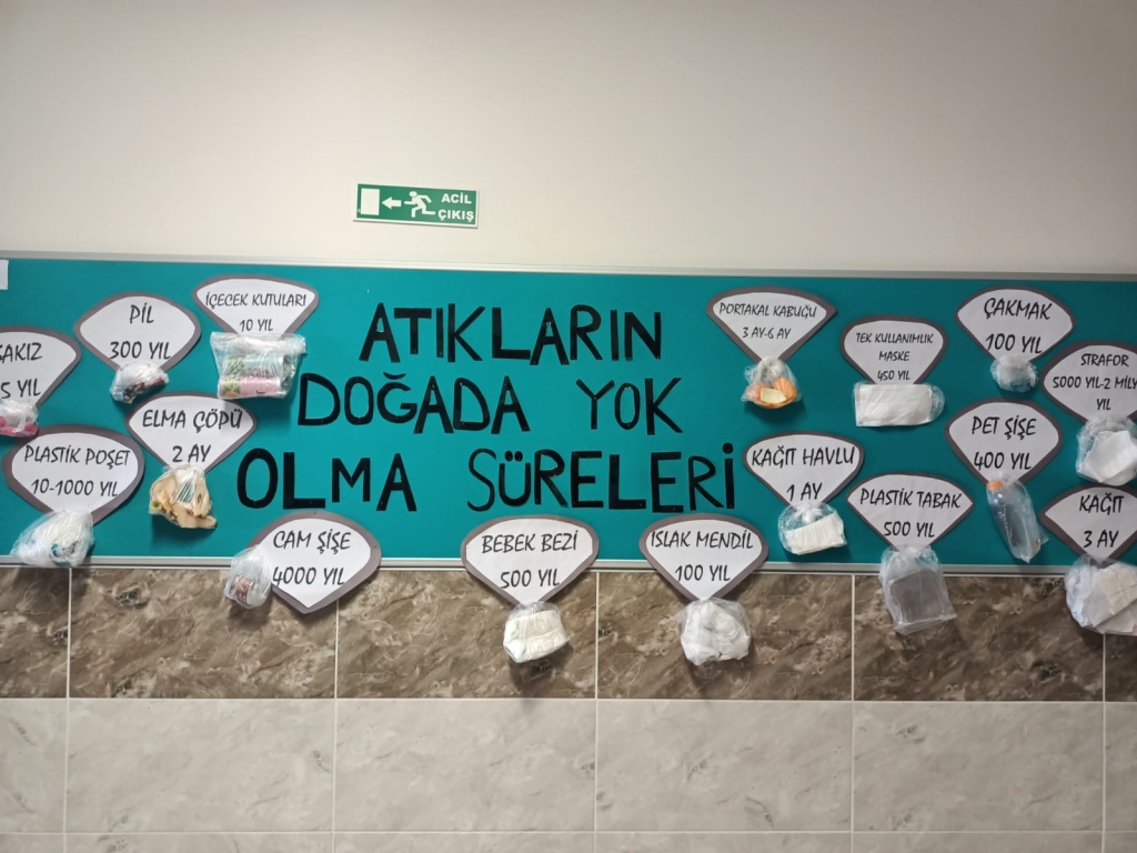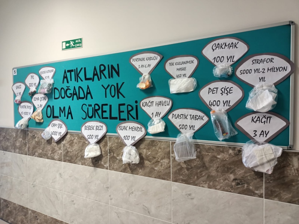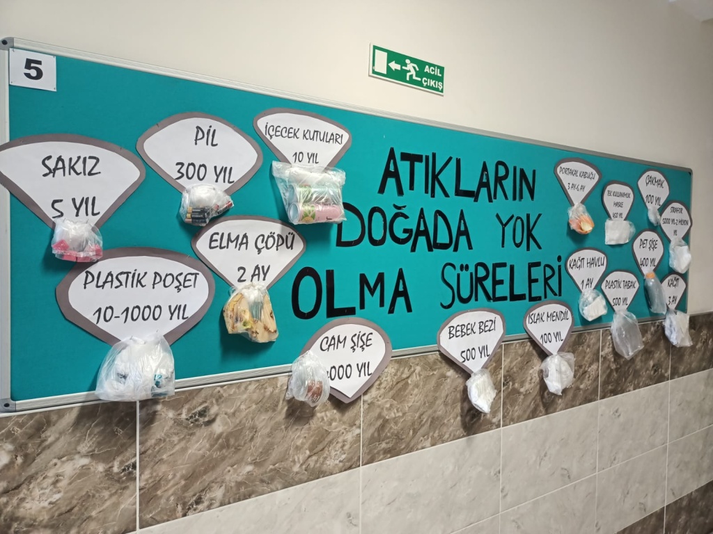 Atıkların doğada yok olma süresi atığın türüne göre değişir. Organik atıklar kısa sürede (günler–aylar) çözünürken, plastik, cam, pil gibi atıklar yüzlerce hatta binlerce yıl doğada kalabilir. Bu nedenle geri dönüşüm, atıkları azaltma ve doğru bertaraf etme, çevreyi korumak için çok önemlidir. Atıkların doğada yok olma sürelerini öğrencilerimizin kalıcı olarak öğrenebilmesi için de okulumuza görsel zenginlik kattık.