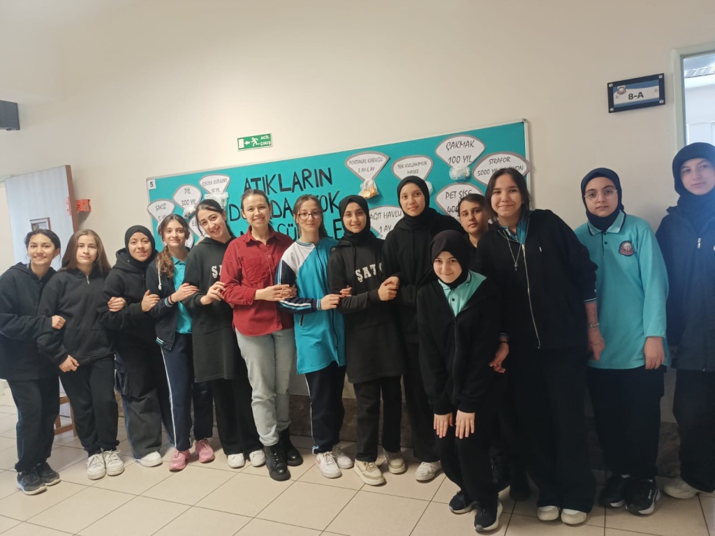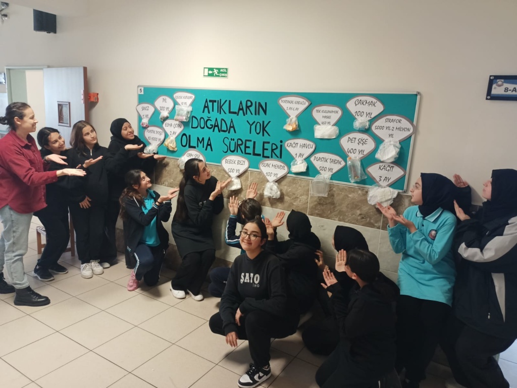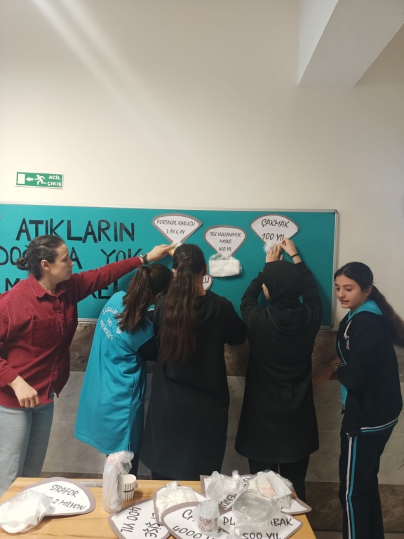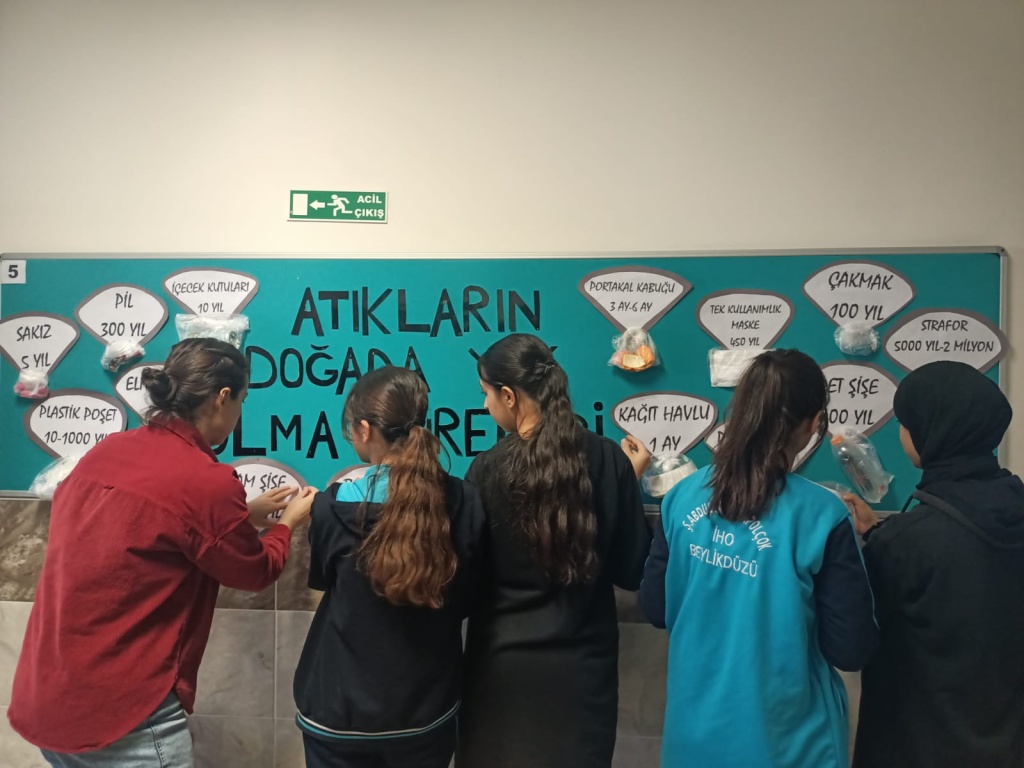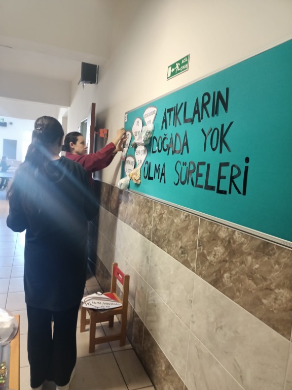 Atıkların doğada yok olma süresi atığın türüne göre değişir. Organik atıklar kısa sürede (günler–aylar) çözünürken, plastik, cam, pil gibi atıklar yüzlerce hatta binlerce yıl doğada kalabilir. Bu nedenle geri dönüşüm, atıkları azaltma ve doğru bertaraf etme, çevreyi korumak için çok önemlidir. Atıkların doğada yok olma sürelerini öğrencilerimizin kalıcı olarak öğrenebilmesi için de okulumuza görsel zenginlik kattık.